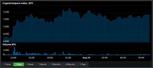 State of the CryptoBitcoin is up 2.04% at $7,083.590 with a volume of Ƀ59.2k - $418.8M on the USD pairs. Ether is up 0.39% against Bitcoin at Ƀ0.04135 per Ether and up 2.57% against the dollar to $292.69 with average volume Ƀ46.5k on the ETH/BTC pair. Bitcoin Cash is down 0.03% to Ƀ0.07887 with volumes of Ƀ14.9k and up 2.09% against the dollar at $557.97. Ripple is down 1.75% to Ƀ0.00004876 with volumes of Ƀ8.7k and up 0.5% against the dollar at $0.345. Zcash is down 0.73% for the day to Ƀ0.02161 per ZEC and up 0.9% against the dollar to $152.71 with an average volume of Ƀ2.7k for the 24 hour period. Litecoin is up 3.32% against the dollar for the day at $62.21 and up 1.07% to Ƀ0.008786 on volumes of Ƀ10.4k. Dash is up 6.44% at Ƀ0.02762 with Ƀ10.0k volume and up 8.38% against the dollar at $195.2. Iota is up 6.97% to Ƀ0.000109 on Ƀ3.5k volume. Ether Classic is up 0.22% to Ƀ0.001844 with volumes of Ƀ8.6k and up 2.27% against the dollar at $13.04. Monero is up 0.14% against the dollar at $105.43 and down 1.52% against Bitcoin at Ƀ0.01491 on volumes of Ƀ1.8k. Neo is down 1.5% for the day to Ƀ0.002895 per NEO and up 0.79% against the dollar to $20.46 with an average volume of Ƀ8.8k for the 24 hour period. Waves is down 3.28% to Ƀ0.0003154 on Ƀ383.98 volume. Stratis is down 3.85% to Ƀ0.0002321 on Ƀ236.25 volume. Cardano is down 0.75% to Ƀ0.00001459 on Ƀ3.1k volume. NEM is up 0.19% to Ƀ0.00001564 on Ƀ613.547 volume. EOS is up 8.53% to Ƀ0.0008432 on Ƀ20.9k volume. Tron is up 3.04% to Ƀ0.00000373 on Ƀ6.7k volume. Stellar is down 0.91% to Ƀ0.0000326 on Ƀ3.3k volume. |