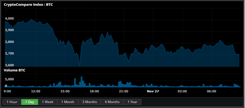 State of the CryptoBitcoin is down 6.88% at $3,706.120 with a volume of Ƀ189.4k - $716.7M on the USD pairs. Ether is down 1.12% against Bitcoin at Ƀ0.02835 per Ether and down 8.2% against the dollar to $105.36 with average volume Ƀ69.3k on the ETH/BTC pair. Bitcoin Cash is up 5.78% to Ƀ0.04815 with volumes of Ƀ8.3k and down 0.87% against the dollar at $197.22. Ripple is up 0.18% to Ƀ0.00009362 with volumes of Ƀ37.5k and down 6.6% against the dollar at $0.3498. Zcash is down 2.57% for the day to Ƀ0.01745 per ZEC and down 8.61% against the dollar to $65.51 with an average volume of Ƀ7.7k for the 24 hour period. Litecoin is down 5.2% against the dollar for the day at $29.37 and up 1.86% to Ƀ0.007951 on volumes of Ƀ21.3k. Dash is up 2.87% at Ƀ0.02369 with Ƀ15.6k volume and down 4.19% against the dollar at $88.95. Iota is up 1.91% to Ƀ0.00007107 on Ƀ738.49 volume. Ether Classic is down 3.13% to Ƀ0.001144 with volumes of Ƀ9.2k and down 9.73% against the dollar at $4.27. Monero is down 9.1% against the dollar at $53.07 and down 2.67% against Bitcoin at Ƀ0.01422 on volumes of Ƀ2.8k. Neo is down 2.21% for the day to Ƀ0.001858 per NEO and down 9.08% against the dollar to $7.01 with an average volume of Ƀ13.1k for the 24 hour period. Waves is down 0.61% to Ƀ0.0002602 on Ƀ791.702 volume. Stratis is up 0.35% to Ƀ0.0001738 on Ƀ180.796 volume. Cardano is down 1.06% to Ƀ0.00000935 on Ƀ1.7k volume. NEM is up 7.95% to Ƀ0.00001901 on Ƀ1.2k volume. EOS is down 0.69% to Ƀ0.0008296 on Ƀ34.3k volume. Tron is down 0.32% to Ƀ0.00000307 on Ƀ2.3k volume. Stellar is down 1.69% to Ƀ0.00003789 on Ƀ4.6k volume. |