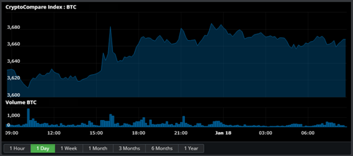 State of the CryptoBitcoin is up 0.95% at $3,667.770 with a volume of Ƀ44.5k - $162.3M on the USD pairs. Ether is up 0.03% against Bitcoin at Ƀ0.03361 per Ether and up 1.02% against the dollar to $122.99 with average volume Ƀ71.9k on the ETH/BTC pair. EOS is up 1.86% to Ƀ0.0006833 on Ƀ33.9k volume. Litecoin is up 2.48% against the dollar for the day at $31.76 and up 1.51% to Ƀ0.008688 on volumes of Ƀ28.5k. Ripple is down 1.25% to Ƀ0.0000894 with volumes of Ƀ27.0k and down 0.12% against the dollar at $0.3278. Zcash is up 0.41% for the day to Ƀ0.01476 per ZEC and up 1.74% against the dollar to $54.51 with an average volume of Ƀ8.3k for the 24 hour period. Tron is up 0.88% to Ƀ0.00000686 on Ƀ8.0k volume. Dash is up 0.56% at Ƀ0.01964 with Ƀ7.7k volume and up 1.66% against the dollar at $72.68. Ether Classic is up 0.76% to Ƀ0.001197 with volumes of Ƀ6.5k and up 1.84% against the dollar at $4.42. Bitcoin Cash is up 0.51% to Ƀ0.03549 with volumes of Ƀ3.5k and up 1.36% against the dollar at $129.34. Waves is down 1.31% to Ƀ0.0007031 on Ƀ3.3k volume. Neo is down 0.72% for the day to Ƀ0.002081 per NEO and up 0.91% against the dollar to $7.73 with an average volume of Ƀ3.2k for the 24 hour period. Stellar is up 0.72% to Ƀ0.00002952 on Ƀ2.6k volume. Cardano is down 1.6% to Ƀ0.00001228 on Ƀ1.8k volume. Monero is up 0.07% against the dollar at $45.85 and down 1.27% against Bitcoin at Ƀ0.0124 on volumes of Ƀ1.3k. NEM is up 0.52% to Ƀ0.00001558 on Ƀ614.09 volume. Iota is up 3.83% to Ƀ0.00008433 on Ƀ576.244 volume. Stratis is down 1.03% to Ƀ0.0002888 on Ƀ556.477 volume. |