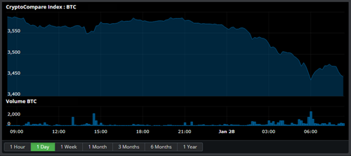 State of the CryptoBitcoin is down 3.81% at $3,448.880 with a volume of Ƀ45.3k - $159.4M on the USD pairs. Ether is down 4.16% against Bitcoin at Ƀ0.0309 per Ether and down 7.99% against the dollar to $106.56 with average volume Ƀ79.9k on the ETH/BTC pair. EOS is down 1.74% to Ƀ0.0006647 on Ƀ46.0k volume. Litecoin is down 5.8% against the dollar for the day at $31.04 and down 2.15% to Ƀ0.008983 on volumes of Ƀ27.5k. Ripple is down 1.26% to Ƀ0.00008602 with volumes of Ƀ22.4k and down 4.92% against the dollar at $0.2979. Tron is down 6.9% to Ƀ0.00000796 on Ƀ17.4k volume. Zcash is down 2.55% for the day to Ƀ0.01416 per ZEC and down 5.88% against the dollar to $49.5 with an average volume of Ƀ11.2k for the 24 hour period. Bitcoin Cash is down 8.25% to Ƀ0.03182 with volumes of Ƀ10.7k and down 11.32% against the dollar at $109.51. Waves is up 2.01% to Ƀ0.0007709 on Ƀ8.1k volume. Dash is down 3.15% at Ƀ0.01936 with Ƀ8.0k volume and down 6.61% against the dollar at $68.05. Stellar is down 6.28% to Ƀ0.00002569 on Ƀ4.7k volume. Ether Classic is down 2.95% to Ƀ0.001152 with volumes of Ƀ4.2k and down 7.19% against the dollar at $4. Neo is down 1.69% for the day to Ƀ0.002038 per NEO and down 5.74% against the dollar to $7.06 with an average volume of Ƀ3.2k for the 24 hour period. Cardano is down 5.64% to Ƀ0.00001104 on Ƀ2.3k volume. Monero is down 4.2% against the dollar at $44.2 and down 0.63% against Bitcoin at Ƀ0.0127 on volumes of Ƀ1.2k. Iota is down 5.88% to Ƀ0.00007415 on Ƀ1.0k volume. NEM is down 5.51% to Ƀ0.00001405 on Ƀ528.287 volume. Stratis is down 7.79% to Ƀ0.0002428 on Ƀ426.618 volume. |