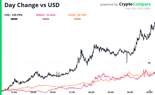 Several tokens are leading the charge in the last 24-hour period. Some of these are well-known cryptocurrencies with more liquid trading pairs, so we’ll be focusing on these over low-cap cryptos that may have higher percentage changes.