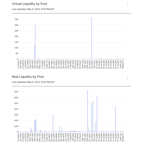 Flipside Crypto’s Eric Stone took a deeper dive into some of the data surrounding v3 using our Velocity dashboards. Most notable, Stone said, were the differences between the real liquidity of v3, and virtual liquidity or the amount of liquidity providers would need to earn the same fees on v2 as they do on v3.